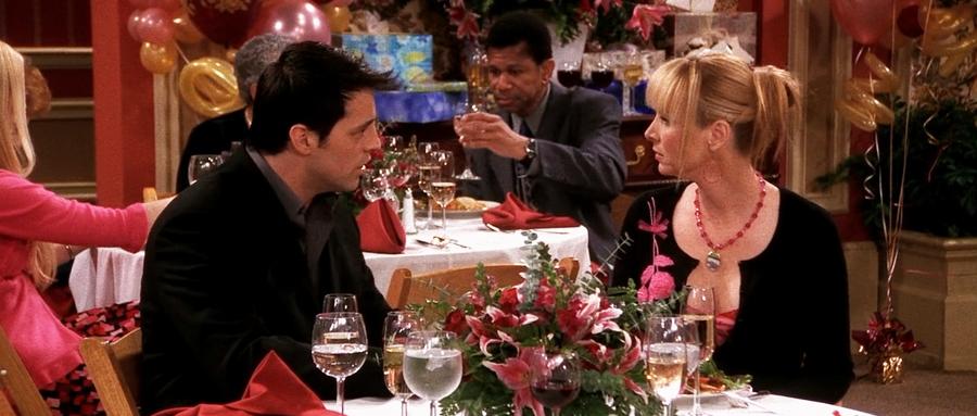 场景:在 Ross 父母的 35 周年结婚纪念日宴会上,Joey 为之前大家嘲讽 Phoebe 男友 Parker 而向她道歉。