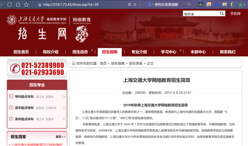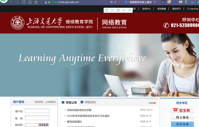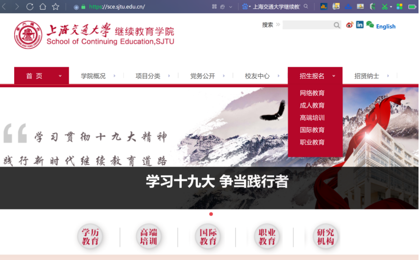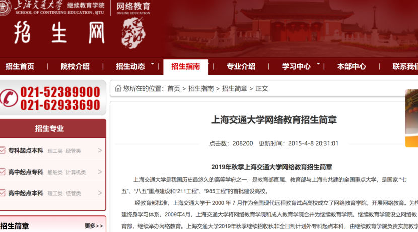 以上海交通大学继续教育学院为例,我们先在百度搜索引擎上面搜索上海交通大学继续教育学院,进入官网,再点击招生信息,就可以看到网络教育这个选项栏。