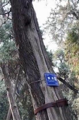 【这棵被称作是赤胆忠心柏,因为它中间那块刨开的树皮就很像一个武将刨开了自己胸膛,向刘秀展示自己的忠心。】